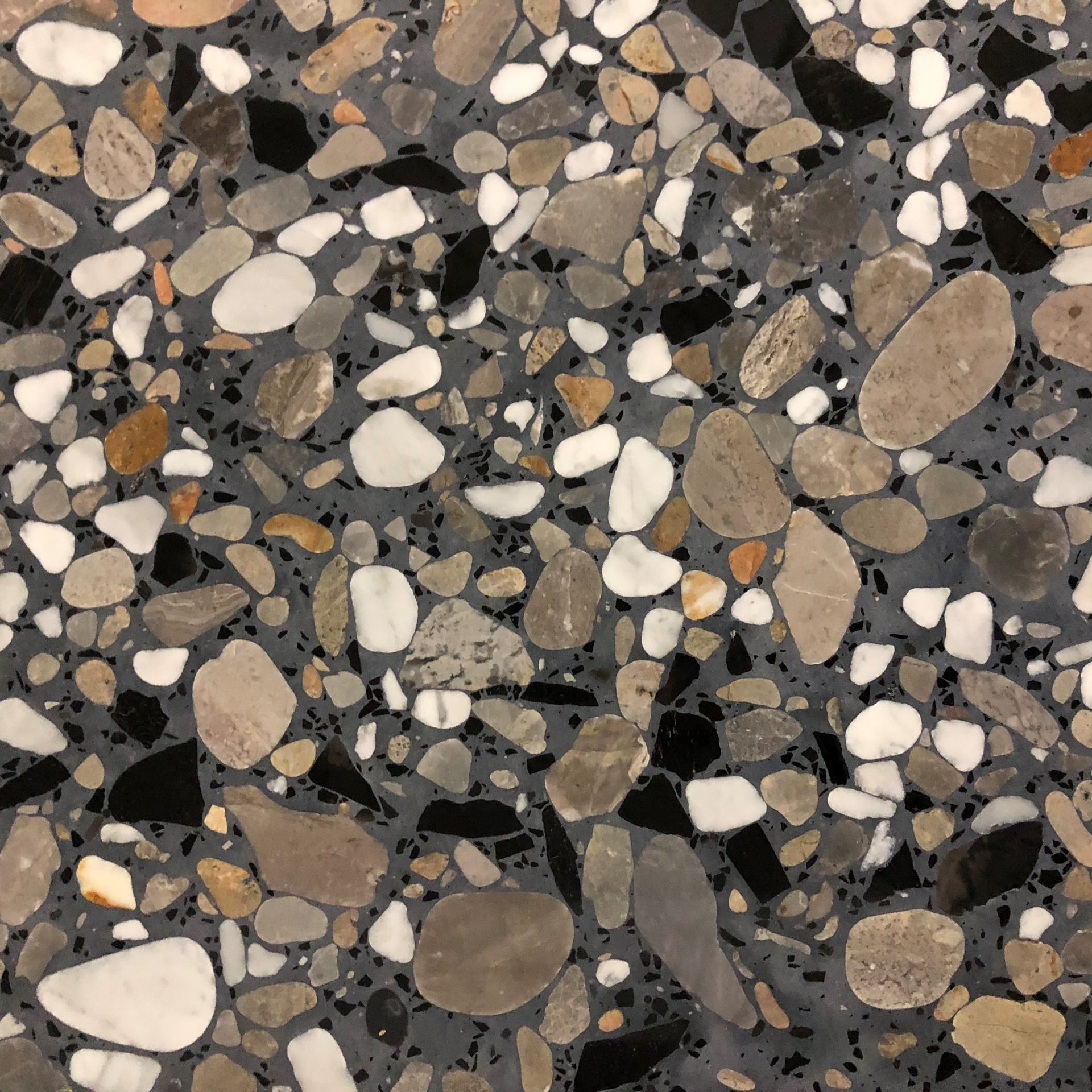 Terrazzo er et materiale laget av en type betong som består av sement, pigmenter, vann og knust natursten. Etter at materialet har herdet slipes det ned. Vår terrazzo kan leveres i plater og fliser. Materialet er hardt og egner seg godt til områder med mye trafikk. Det finnes terrazzo i mange ulike farger og sten kombinasjoner.